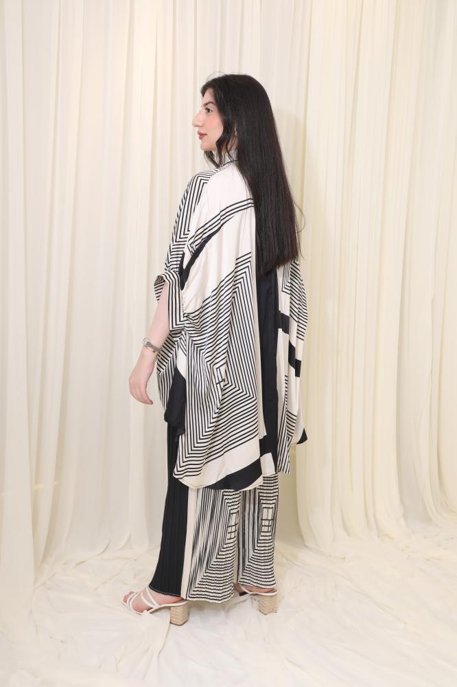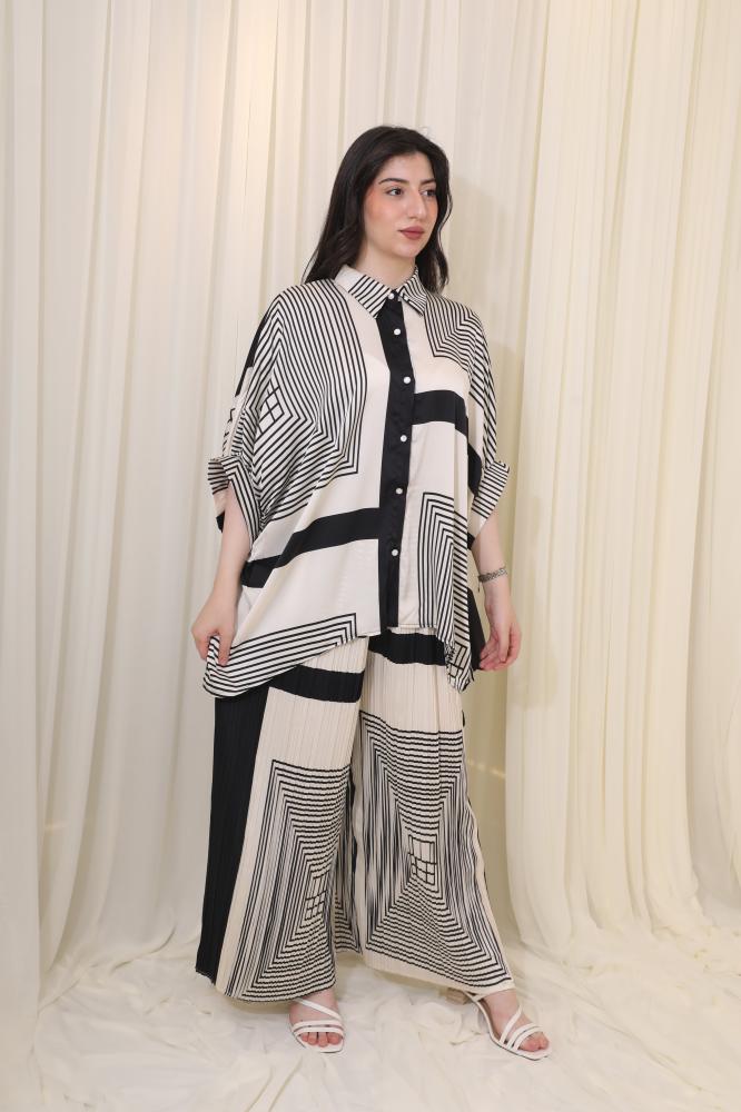 تميزي بإطلالة جريئة وعصرية مع هذا الطقم المميز المكون من بلوزة فضفاضة وبنطلون واسع بنقشة هندسية بالأبيض والأسود. يتميز التصميم بأزرار أمامية وياقة كلاسيكية تضيف لمسة من الرقي، بينما تضمن الخامة الخفيفة والناعمة الراحة طوال اليوم. مثالي للمناسبات الكاجوال أو الإطلالات اليومية الأنيقة. نسقيه مع إكسسوارات بسيطة لتحصلي على مظهر أنيق ولافت في آن واحد